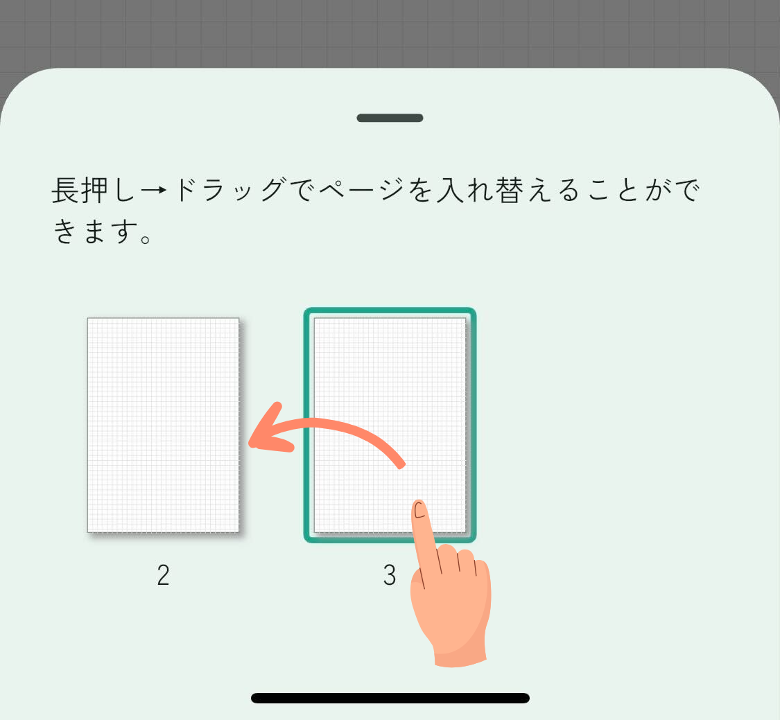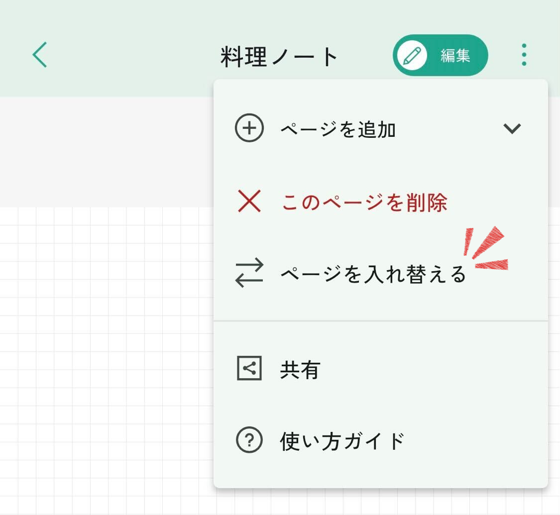 ノート内右上のメニューから「ページ入れ替え」を選択すると、ドラッグでページの順番を入れ替えることができます。