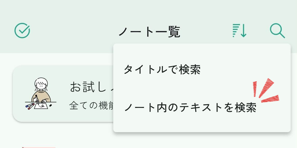 ノート一覧画面の検索ボタンから「ノート内のテキストを検索」を選択すると、ノート内に挿入したテキストを検索することができます。